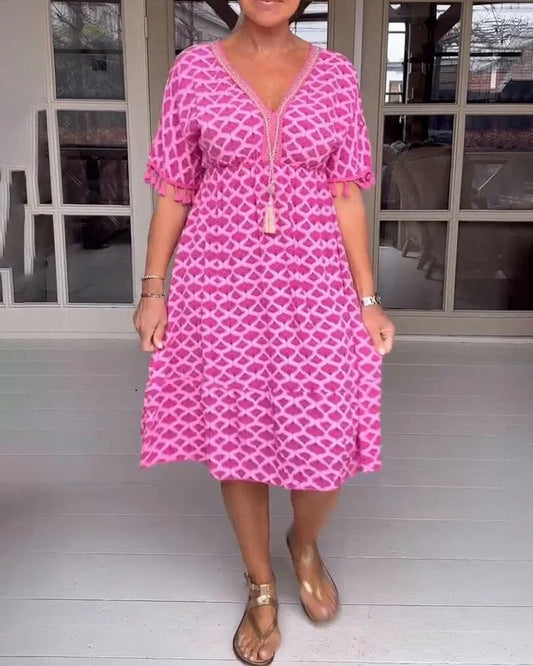 🔥V-neck Tassel Edge Sleeve Print Midi Dress