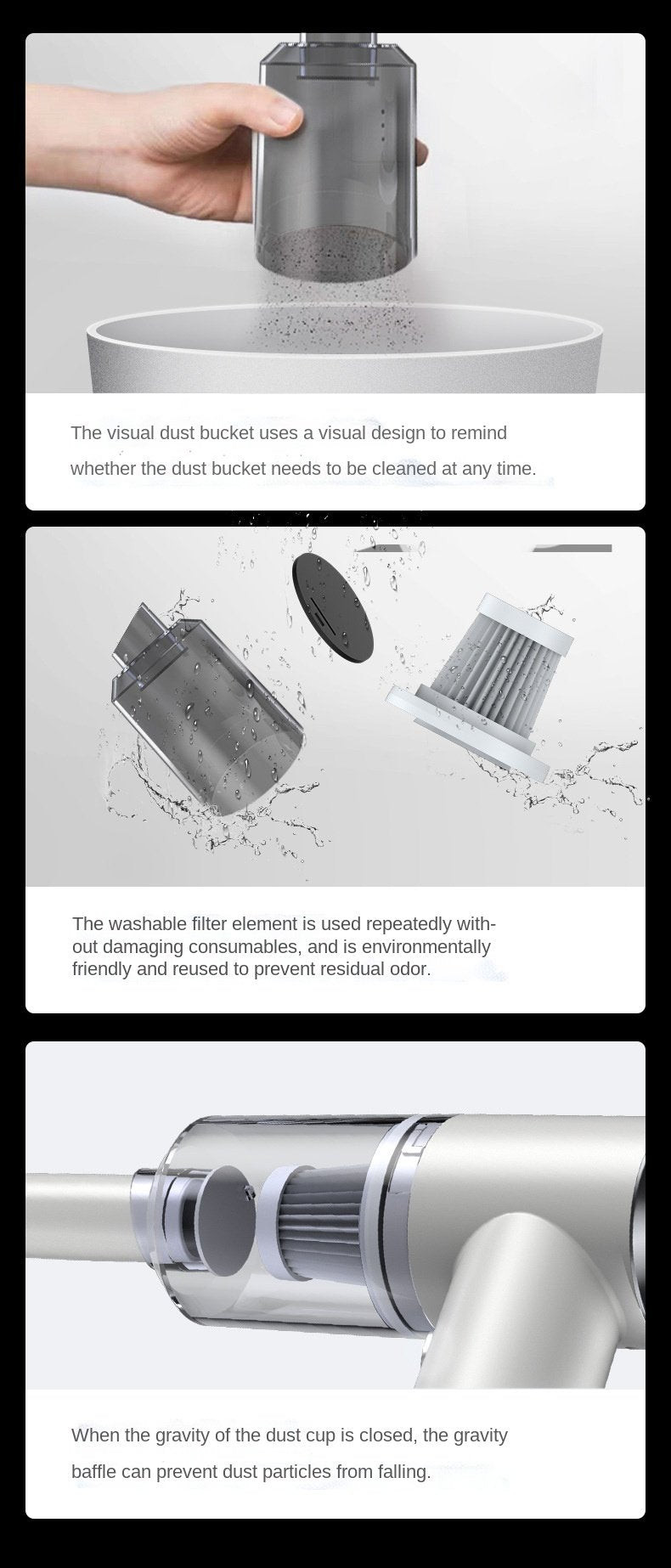 [Upgrade and thick washable filter] Take the filter out of the dust cup of the Cordless handheld vacuum, wash it with water and dry it for the second time.The filter is safe to be soaked and washed.